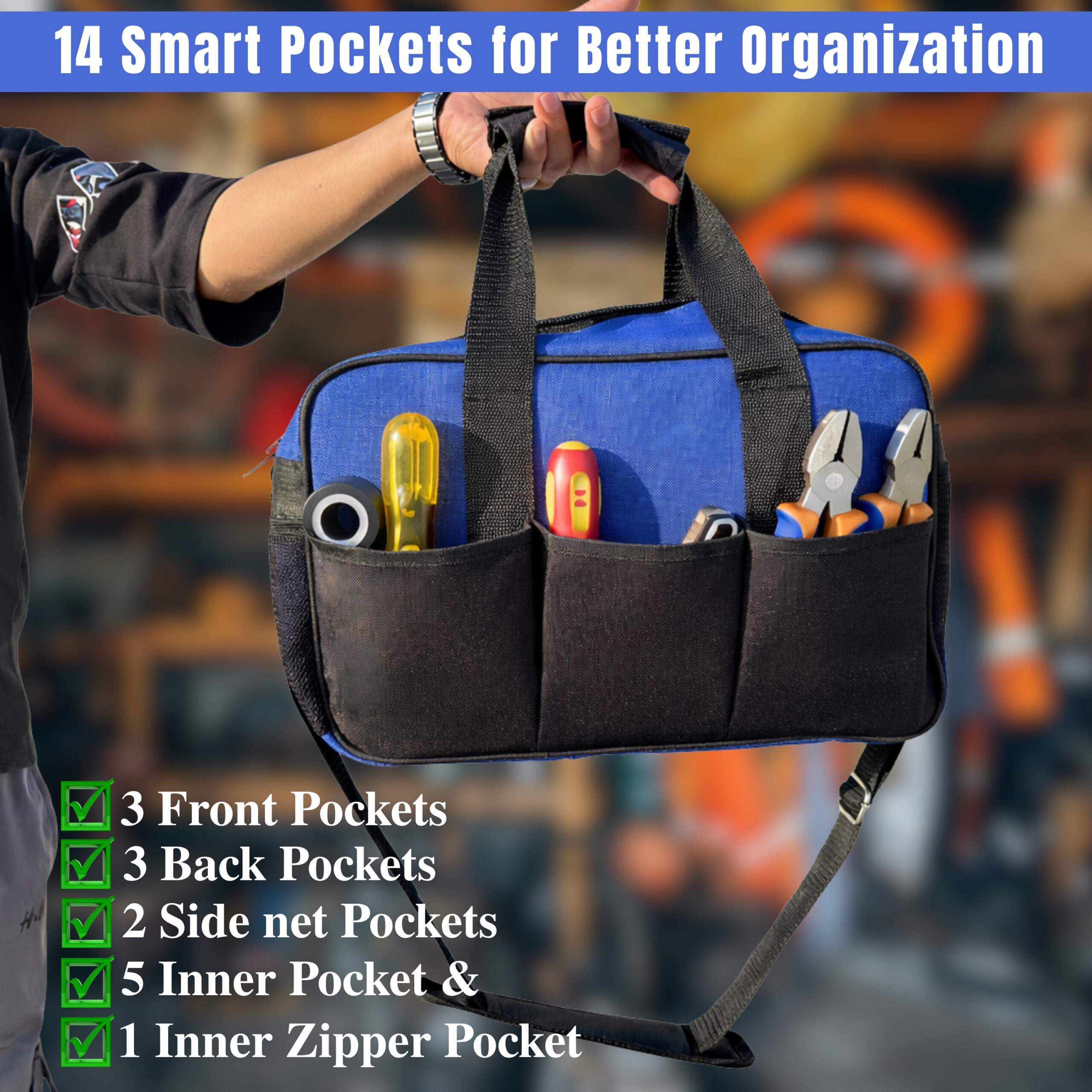- Plastic pad at the bottom of the tool bag for technician,14 Pockets